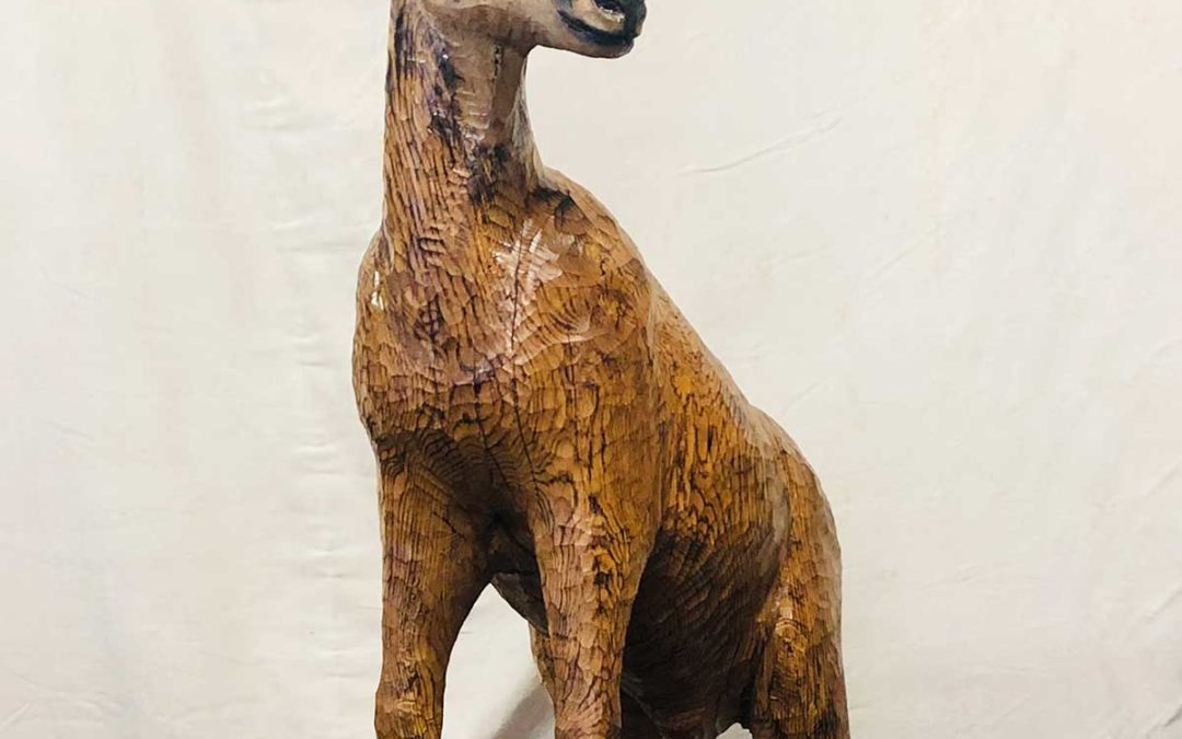 Sculpture d’un chamois en bois de chêne grandeur nature.